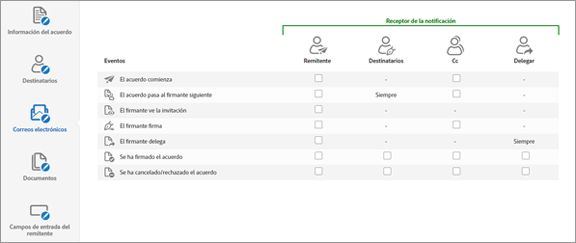 Al crear flujos de trabajo, los administradores pueden controlar ahora qué mensajes de correo electrónico se enviarán durante el proceso de firma y aprobación. Los administradores especificarán quién debe recibir las notificaciones por correo electrónico basadas en diversos casos. Por ejemplo, los administradores pueden especificar que los correos electrónicos de notificación se envíen a los destinatarios y a los cc cuando un acuerdo se ha cancelado.