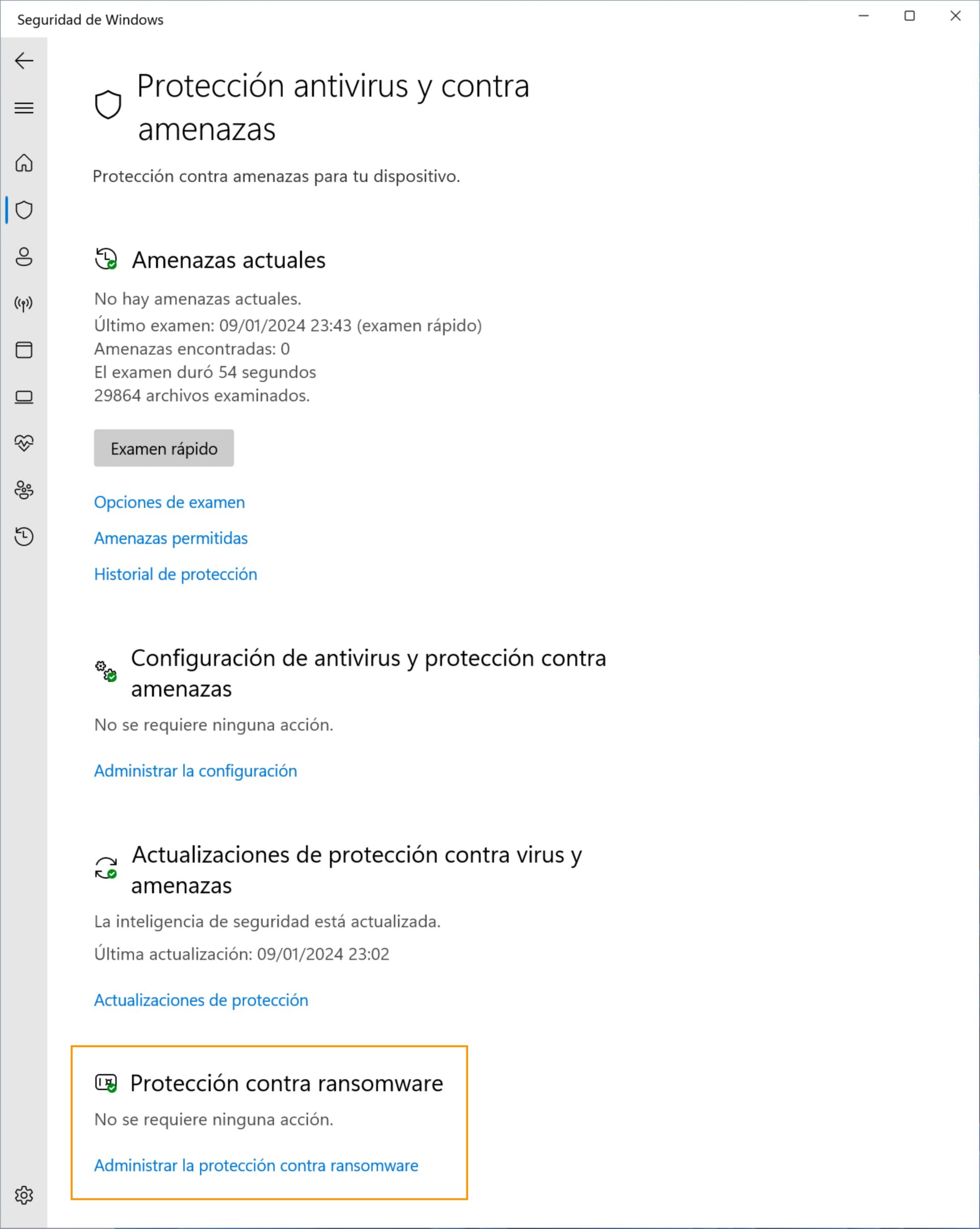 En la configuración de Protección antivirus y contra amenazas, seleccione Protección contra ransomware.