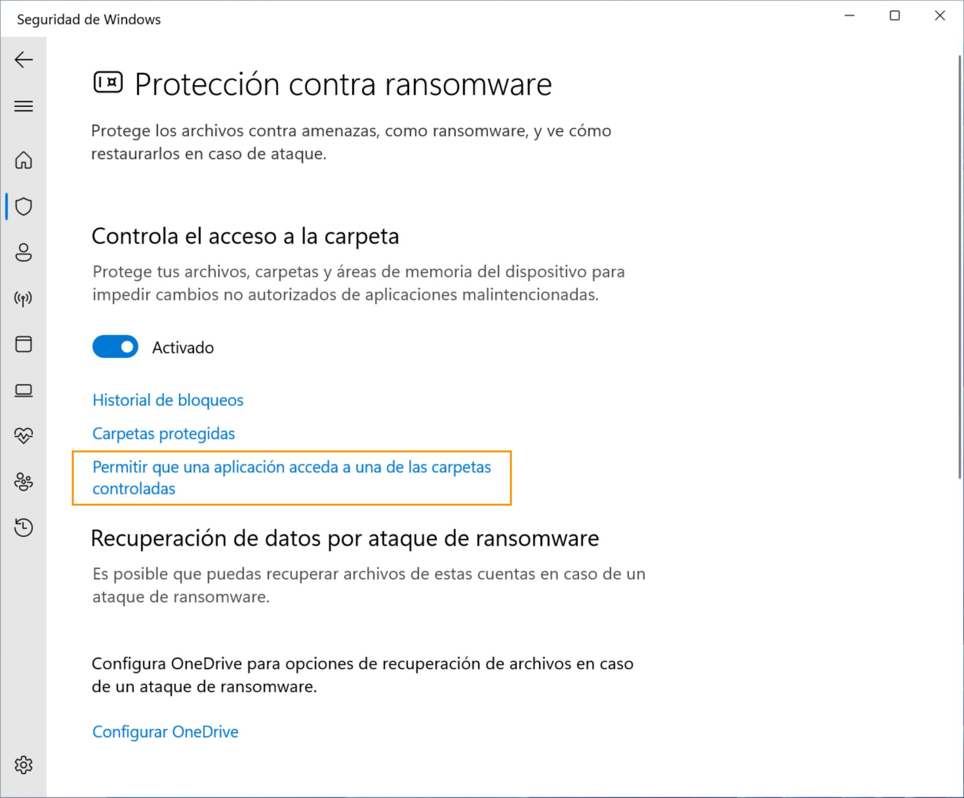 Seleccione la opción Permitir que una aplicación acceda a una de las carpetas controladas.