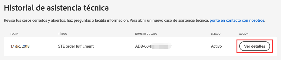 Seleccione Ver detalles para el número de caso que había recibido anteriormente de Adobe.