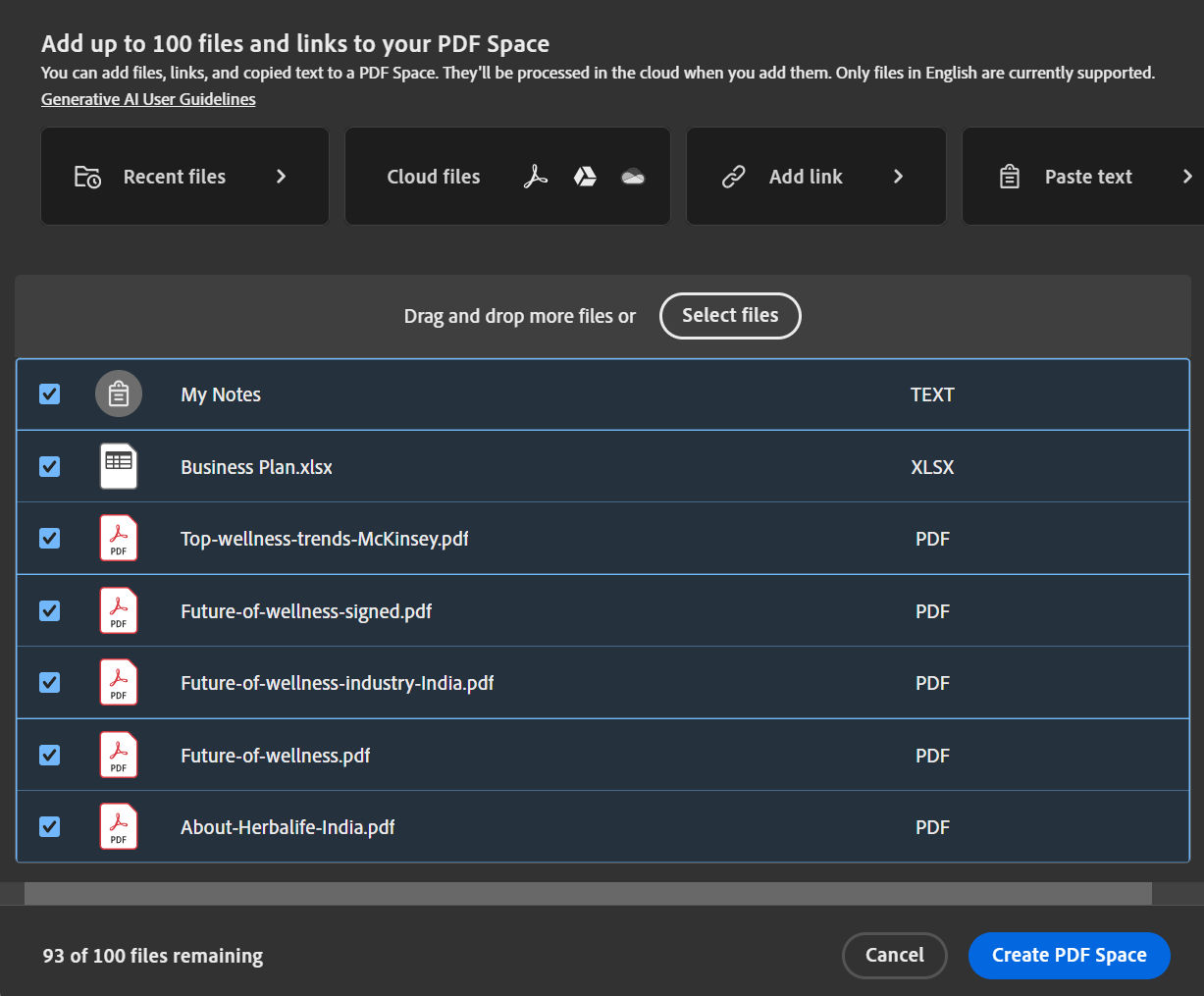PDF Spaces is an AI-powered knowledge hub within Acrobat that allows you to uncover actionable insights from files and links, and collaborate easily with others.