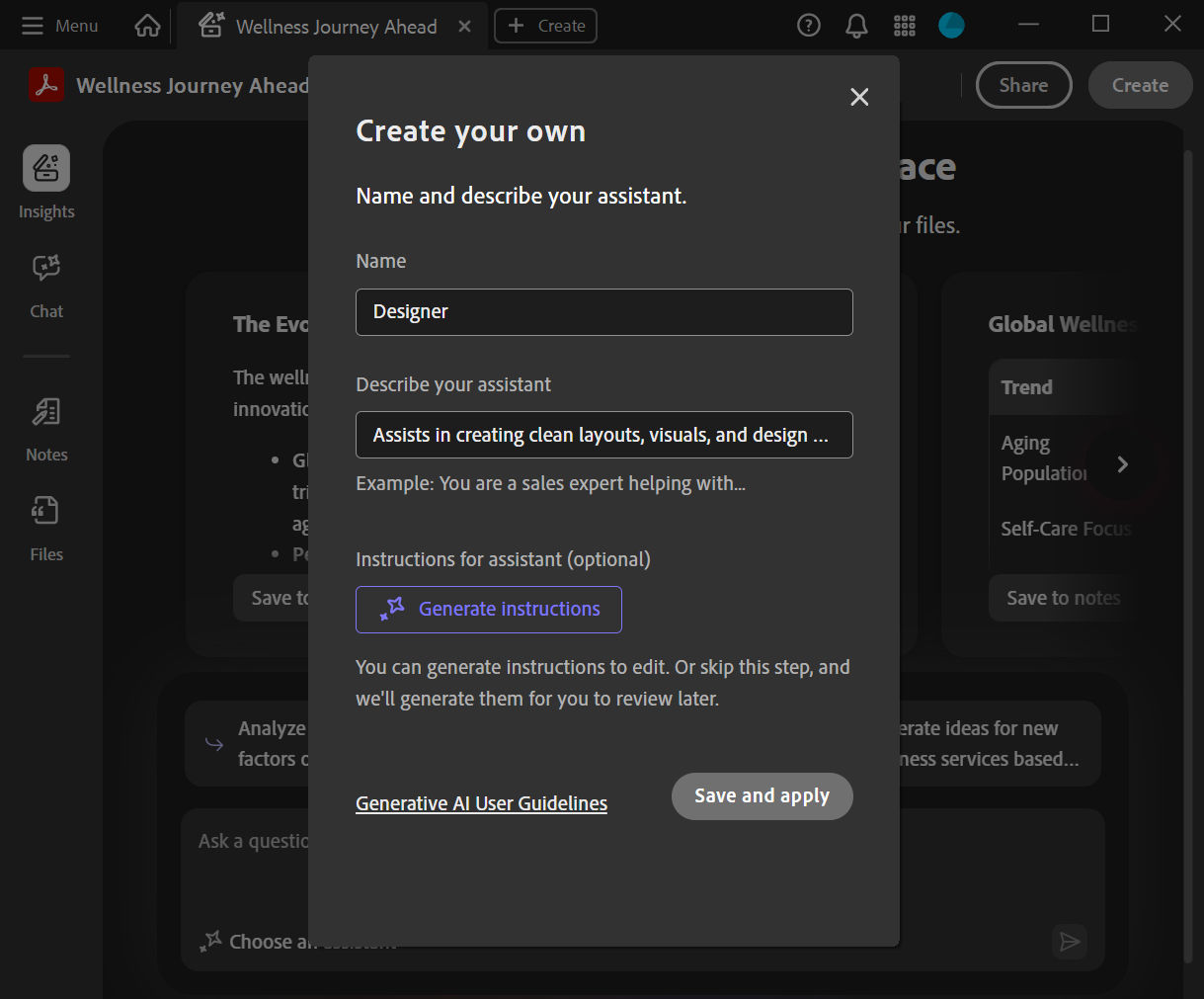 Using a prebuilt AI Assistant, extract key themes and summaries with citations from your files. For tailored insights, create a personalized AI Assistant. |