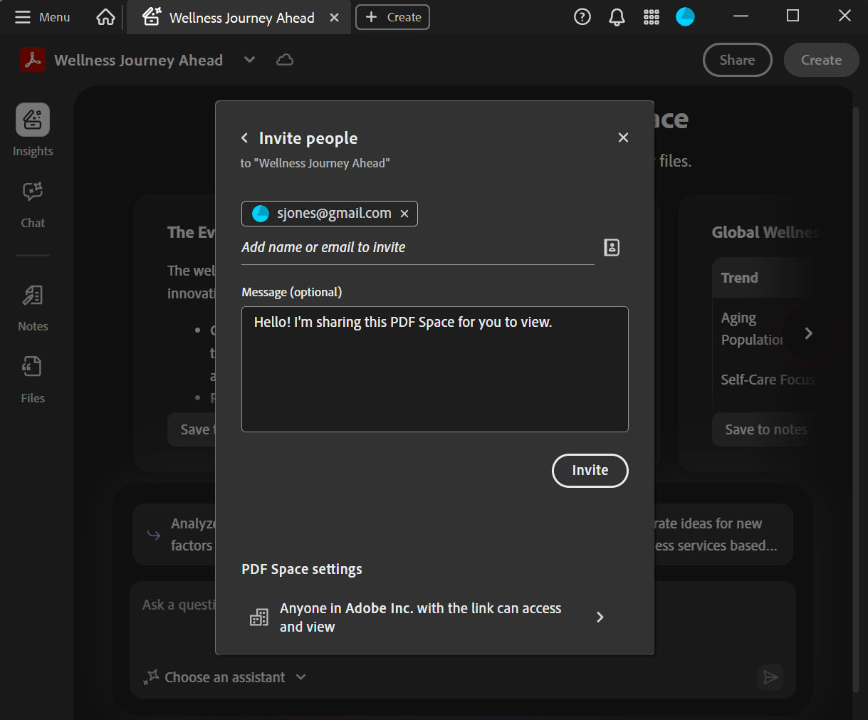 Share your PDF Space so collaborators can view your files and notes, and chat with your personalized AI Assistant. |