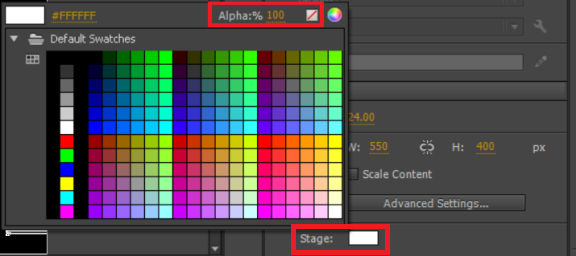 2. In the Properties panel, select Stage color and set the Alpha percentage as 0.