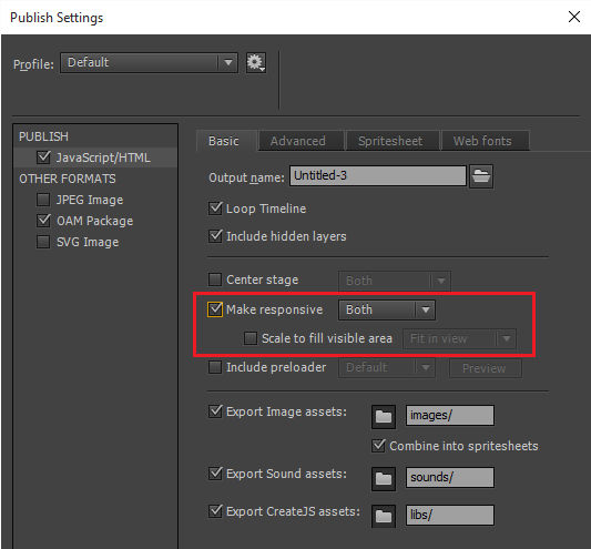 2. In the Basic tab, select Make Responsive checkbox. This ensures that the animation is responsive with reference to Width, Height, or both and resizes the published output based on various form factors. The result is a responsive, sharper and a crisper HiDPI compliant output.
