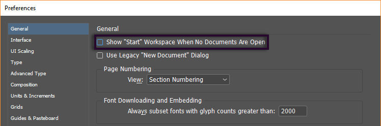- Clear the Show "Start" Workspace When No Documents Are Open check box.