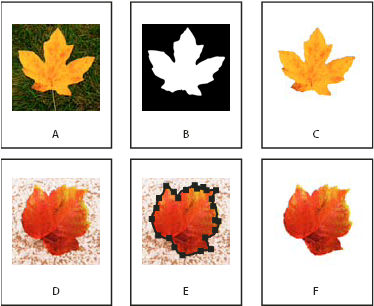 A. Original graphic B. Alpha channel C. Placed graphic D. Original graphic E. Graphic with embedded path F. Placed graphic