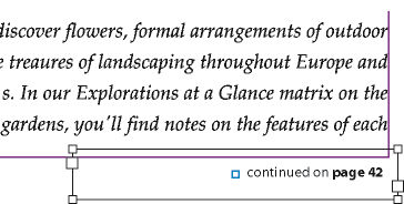 You can easily maintain the jump lines of stories that continue to other pages, such as a line that says “Continued on page 42.” Use a jump line page number to automatically update the number of the page containing a story’s next or previous threaded text frame when you move or reflow the story’s threaded text frames.