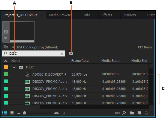 Premiere Pro provides Search Bins that offer powerful metadata searching capabilities. When you search for items in the Project Panel, you can associate a Search Bin with your search query. The search results stay up to date with items that meet the search criteria.
