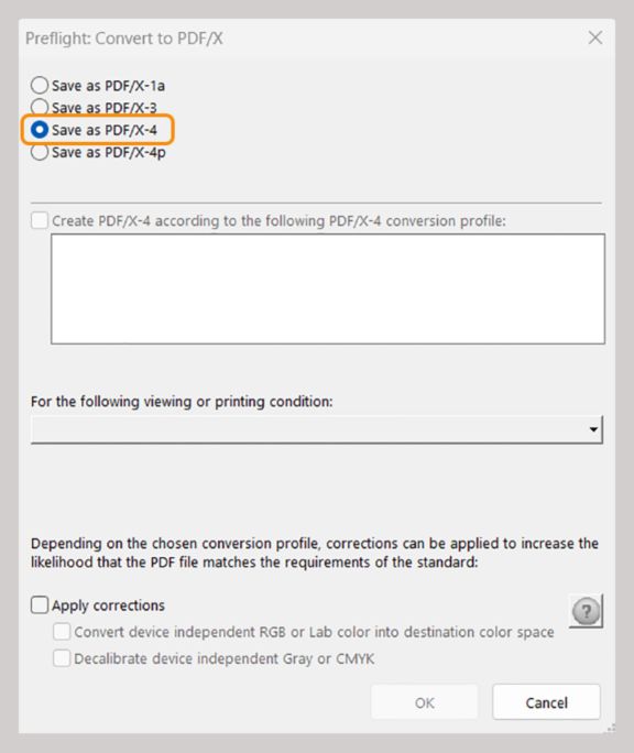 Opmerking:U kunt de beschikbare PDF/X-4-conversieprofielen selecteren die in de sectie PDF/X-4 maken overeenkomstig het volgende PDF/X-4-conversieprofiel worden weergegeven, en vervolgens desgewenst Correcties toepassen.
