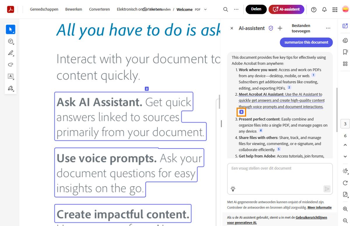De functie AI-assistent biedt AI-gegenereerde antwoorden op vragen op basis van de content van de geselecteerde bestanden. De functie markeert tevens het gedeelte van de inhoud waar het antwoord vandaan komt, voor meer context. De AI Assistant stelt tevens vervolgvragen voor op basis van de oorspronkelijke vraag.