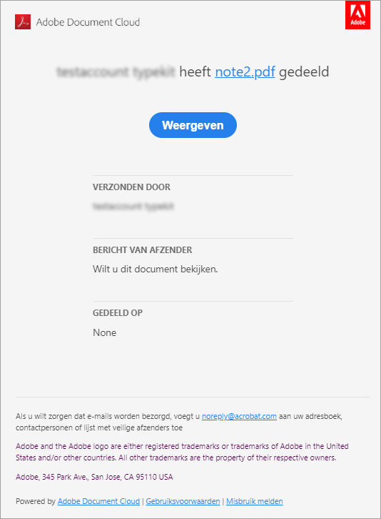 U kunt een koppeling naar een PDF-document delen, zodat andere gebruikers het kunnen bekijken of opmerkingen kunnen plaatsen. Het gedeelde document kan op elk apparaat worden geopend en wordt veilig opgeslagen in de Adobe-cloudopslag. Ontvangers krijgen een e-mail met een koppeling om het document te bekijken in een browser en opmerkingen te plaatsen, zonder zich te hoeven aanmelden.