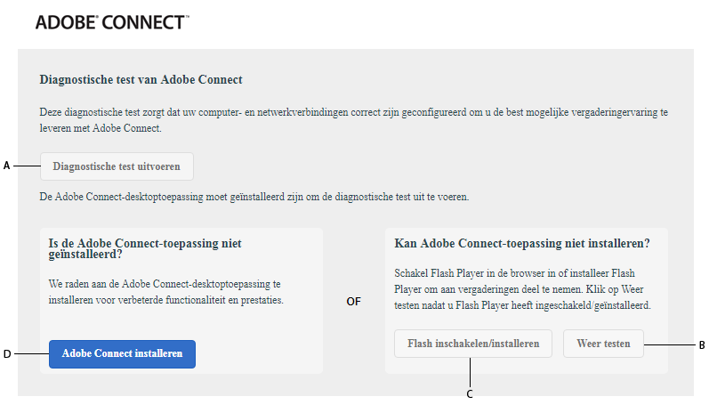 Als u de test voor aanvang van de vergadering wilt uitvoeren, moet u de Adobe Connect-desktoptoepassing hebben Als geen van beide is geïnstalleerd, wordt op de pagina van de test voor aanvang van de vergadering het dialoogvenster Diagnostische test van Adobe Connect weergegeven.