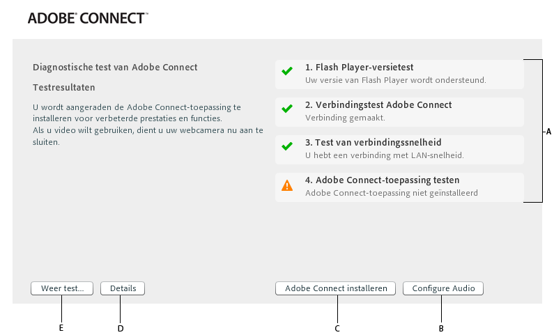 De test voor aanvang van de Adobe Connect-vergadering controleert uw computer en netwerkverbindingen en helpt u verbindingsproblemen op te lossen voordat uw vergadering begint.