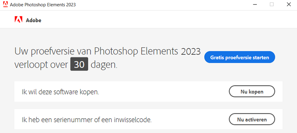 Op het scherm ziet u hoeveel dagen er nog resteren in de gratis proefperiode voor Photoshop Elements 2026. Op het scherm ziet u hoeveel dagen er nog resteren in de gratis proefperiode voor Photoshop Elements 2026. -