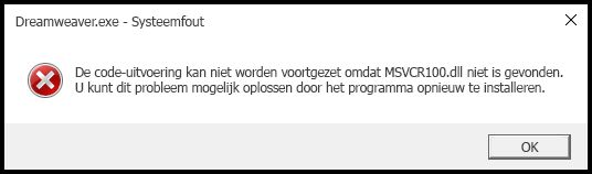 Dreamweaver geeft een fout weer als Microsoft Visual C ++ (x64 en x86) runtime niet beschikbaar is of niet op het systeem is geïnstalleerd.