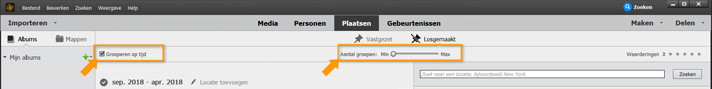 U kunt het aantal weergegeven tracks wijzigen door de schuifregelaar Aantal groepen te verplaatsen. Verplaats de schuifregelaar naar links (naar Min) om meer mediabestanden te groeperen in het tijdsbestek waarin deze bestanden zijn gemaakt. Met andere woorden, er worden minder tracks weergegeven als u de schuifregelaar naar links verplaatst. En er worden meer tracks weergegeven als u de schuifregelaar naar rechts verplaatst (naar Max).