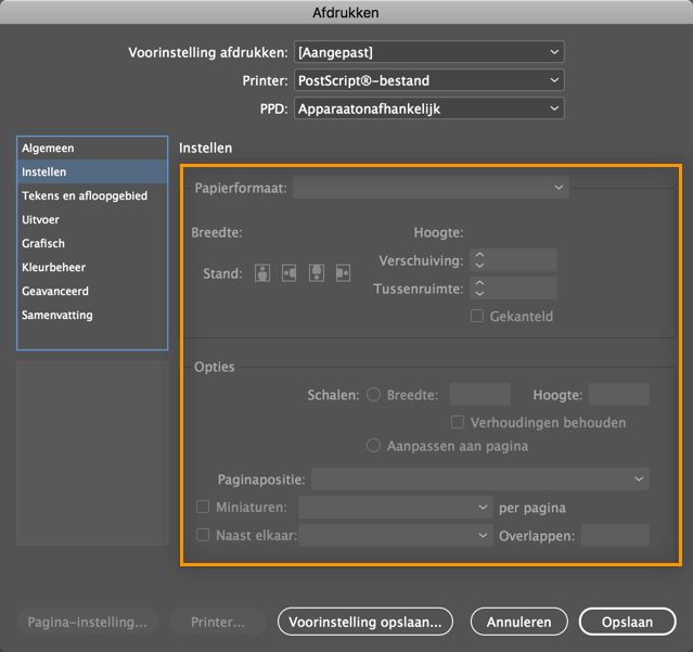 Tijdens het afdrukken van een InDesign-document als PostScript-bestand zijn de opties om de pagina aan te passen uitgeschakeld.