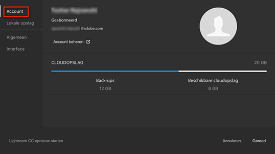 Hiermee wordt weergegeven hoeveel ruimte foto's in beslag nemen waarvan een back-up is gemaakt in de cloud, en de Beschikbare cloudopslag die is gekoppeld aan uw Creative Cloud-lidmaatschap.