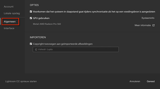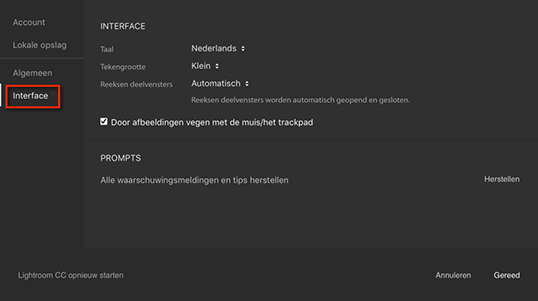 U wordt gevraagd Lightroom opnieuw op te starten om de gewijzigde instelling toe te passen. Selecteer Opnieuw opstarten om uw instellingen meteen toe te passen.