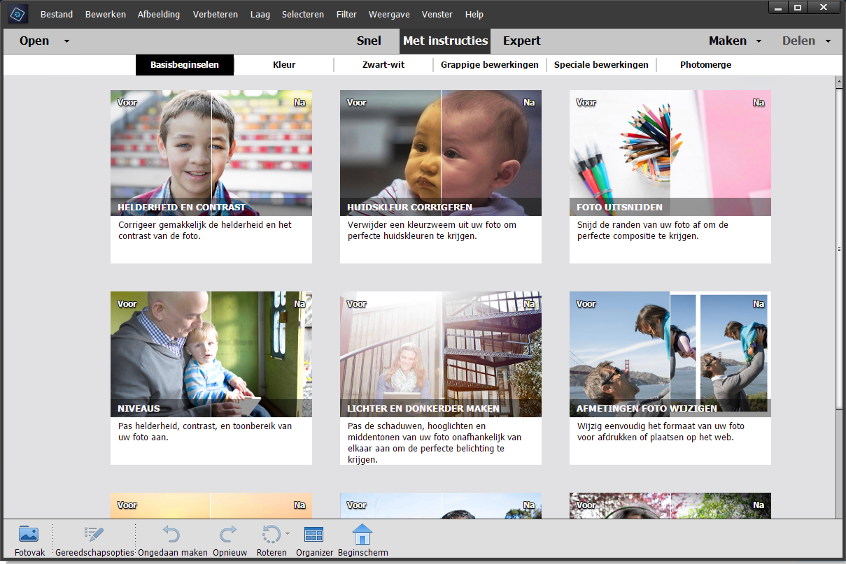 Op het scherm voor de modus Met instructies zijn Bewerkingen met instructies gegroepeerd in zes categorieën. Open de foto die u wilt verbeteren en klik op de miniatuur voor de categorie die u verder wilt verkennen.