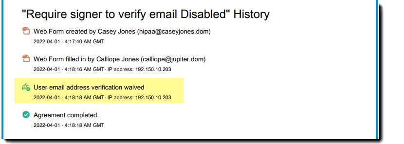 Wanneer Ondertekenaar verplichten om e-mailadres te verifiëren is uitgeschakeld, hoeft de deelnemer zijn/haar e-mailadres niet te verifiëren om het ondertekeningsproces te voltooien. De overeenkomst gaat uit van een voltooide status of gaat naar de volgende deelnemer.
