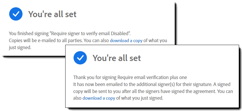 Als de optie Vereisen dat ondertekenaar zijn of haar e-mailadres verifieert is uitgeschakeld, wordt elke poging tot ondertekening geaccepteerd en wordt de overeenkomst weergegeven op de pagina Beheren.