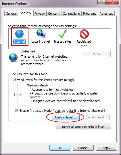 Aktiver skripting også for Internett-sonen: Velg Internett-sonen, klikk på knappen Egendefinert nivå og merk av for Aktiver ved Aktiv skripting.