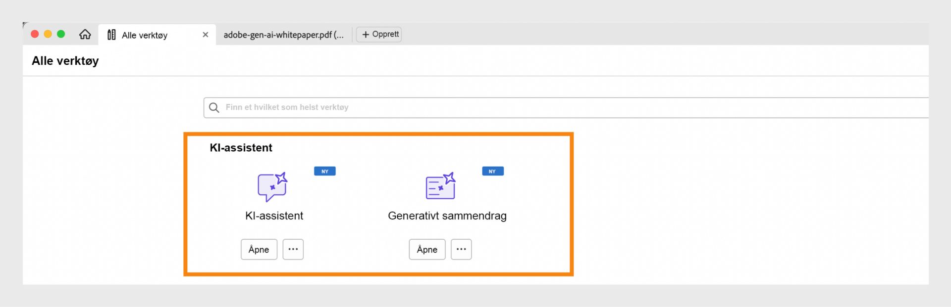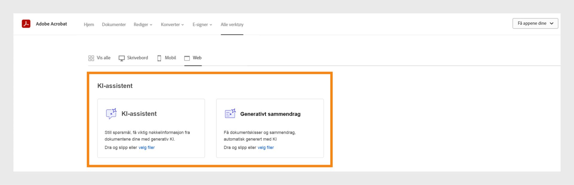 Alternativt kan du velge Alle verktøy i Acrobat Hjem, og deretter verktøyene AI Assistant eller Generativt sammendrag.