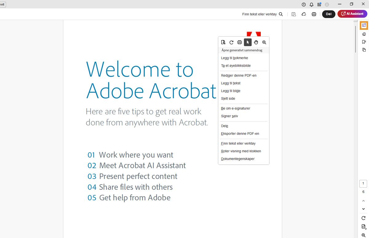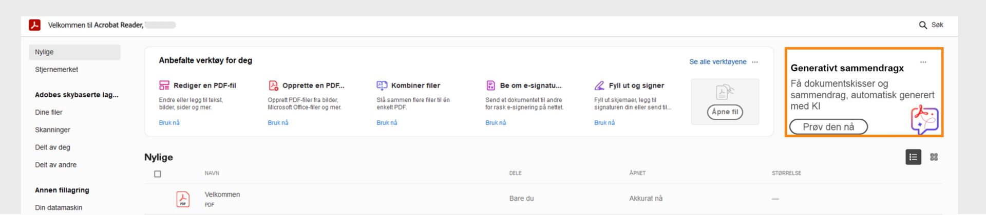 De generative KI-funksjonene i Acrobat Reader rulles ut i faser og er ikke tilgjengelig for alle brukere.