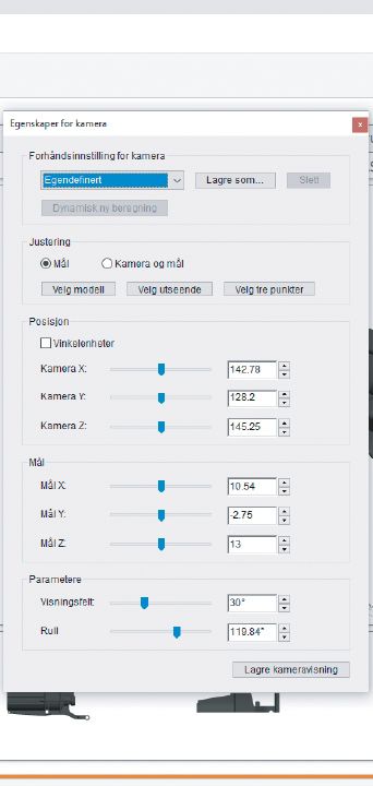 Justerer kameraegenskapene i forhold til kameraretningen og målposisjonen.