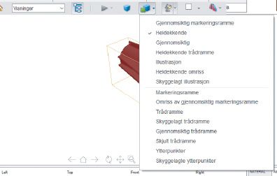 Endrer overflateutseendet for hele 3D-modellen i henhold til det du velger på undermenyen: Gjennomsiktig markeringsramme, Heldekkende, Gjennomsiktig, Heldekkende trådramme og så videre.