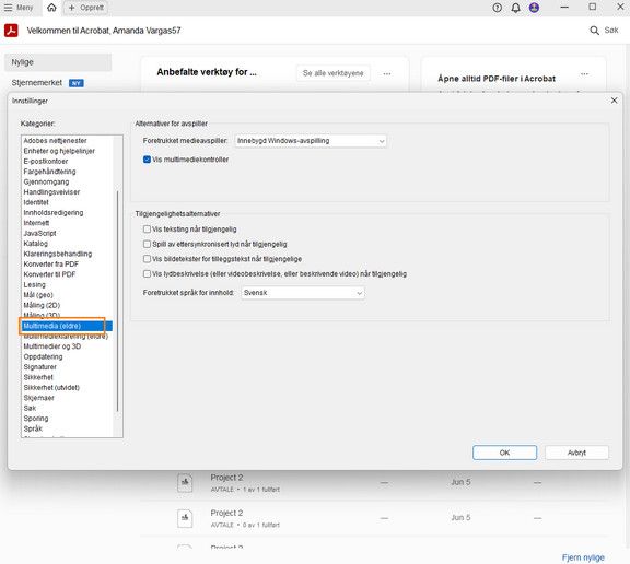 For å beskytte datamaskinen mot virus, spør Acrobat om du vil spille av multimediefiler fra kilder som ikke er klarerte. Du kan endre denne standardvirkemåten i Innstillinger > Multimedieklarering (eldre) > Tillat multimedieoperasjoner.