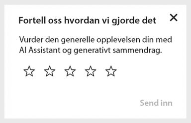 Etter at du har brukt KI-funksjonene fire eller flere ganger, ber Acrobat eller Acrobat Reader deg rangere totalopplevelsen med funksjonene AI Assistant og Generativt sammendrag. Velg en rangeringen og send inn. Kontrollprogrammet viser et tekstfelt hvor du kan gi tilbakemeldingen hvis rangeringen din er to eller mindre.