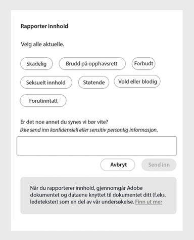 Du kan til og med rapportere innhold som opplever som upassende. Adobe vil gjennomgå bekymringene dine og eventuelt iverksette nødvendige tiltak.