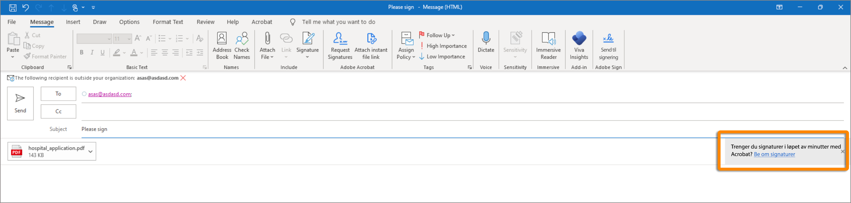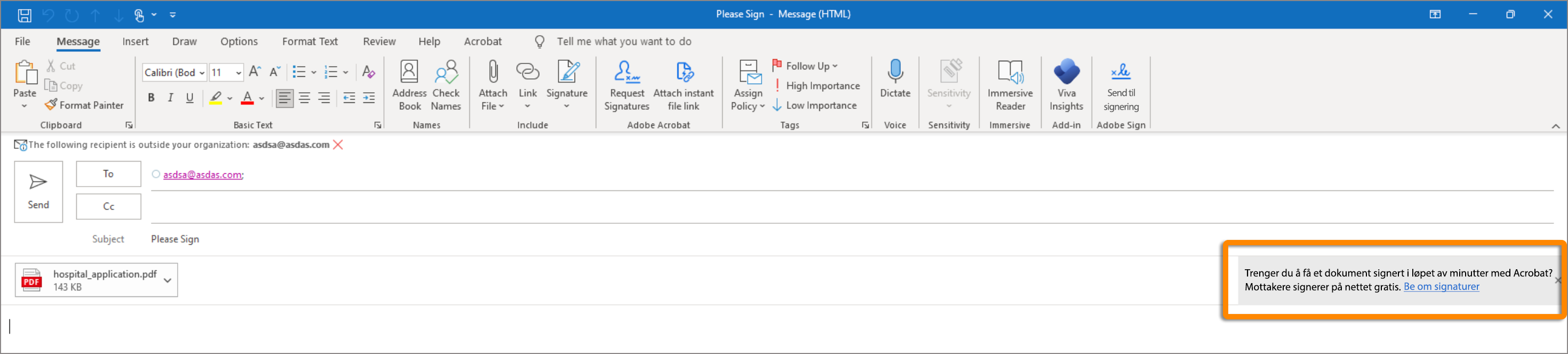Hvis du skriver en e-postmelding og legger ved et PDF-dokument, spør Acrobat deg om du vil bruke Be om signaturer-verktøyet basert på PDF-filnavnet og e-postemnet. Hvis du for eksempel bruker begreper som bl.a. skjema og søknad, gjenkjenner Acrobat disse begrepene og spør om du vil bruke verktøyet Be om signaturer i Acrobat. Du ser en av følgende meldinger: