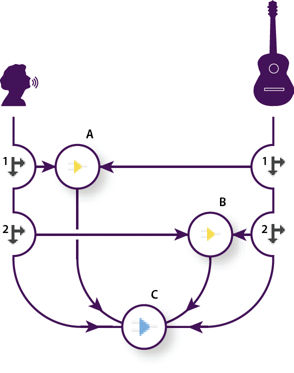A. Send 1 outputs to delay bus B. Send 2 outputs to reverb bus C. Mix track combines vocal, guitar, delay, and reverb outputs