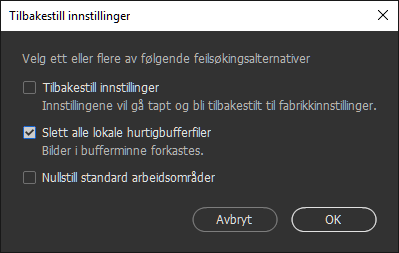 - Velg Slett alle lokale bufferfiler i dialogboksen Tilbakestill innstillinger. Hvis du ønsker mer informasjon, kan du se Gjenopprette innstillinger.