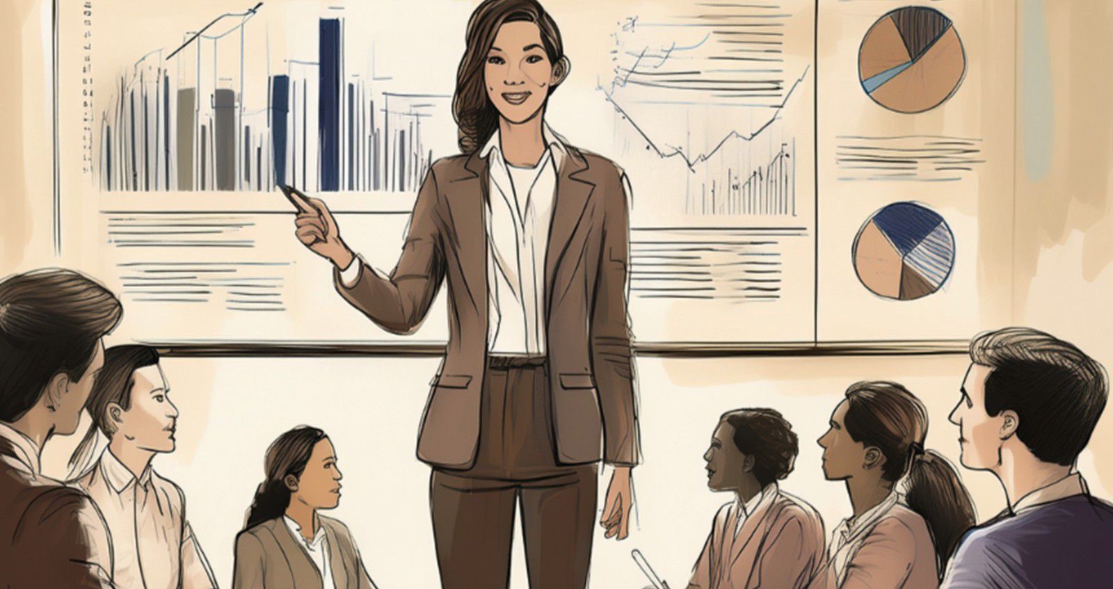 For example, a sketch showing characters positioned in front of charts can be used as a reference to produce an image with similar framing and layout, such as characters placed in front of digital screens displaying data. This ensures visual consistency across slides and modules, helping learners focus on content without distraction.