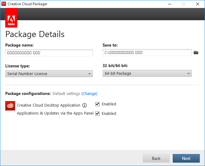 I Windows 10, hvis du bruker japanske 2-byte-tegn eller koreanske tegn for å opprette en pakke, blir språktegnene gjengitt som tomme firkanter i brukergrensesnittet til Creative Cloud Packager. (Se bildene nedenfor.)