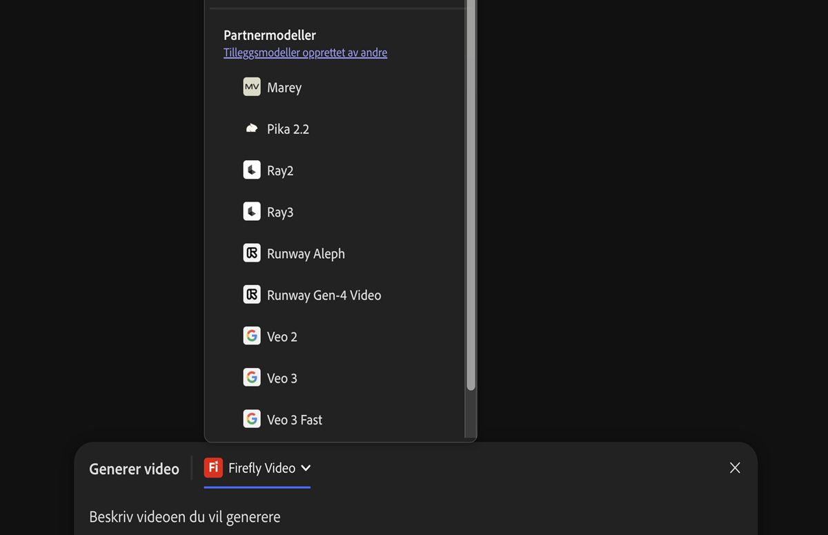 Hvis du vil bruke generative KI-funksjoner, for eksempel bildegenerering, fjerning av bakgrunn, generativt fyll eller generativ utvidelse og videogenerering, må du ha generative kreditter. For Premium-funksjoner, som å bruke partnermodeller for å generere bilder og videoer, trenger du et Creative Cloud-abonnement som gir tilgang til Premium-funksjoner.