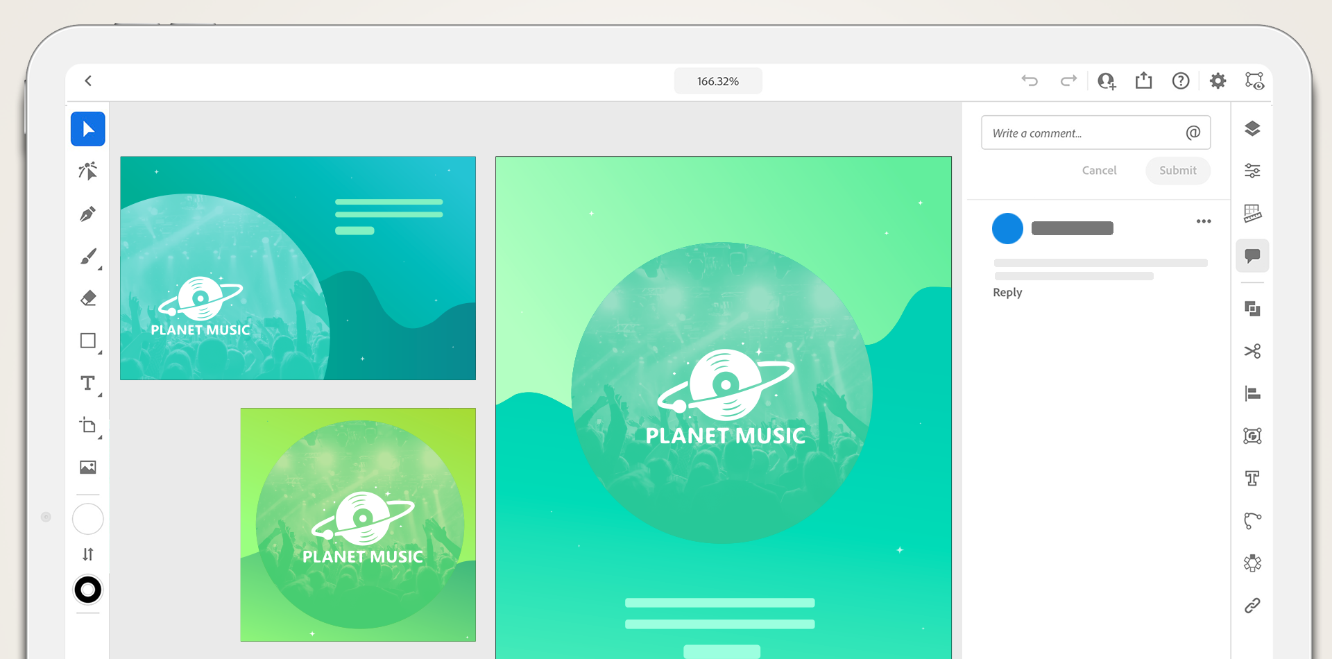 Illustrator makes collaboration easy when you work in a team. With the power of cloud documents, you can share document links for review with other team members and make edits directly from the app. You can either use Illustrator on the desktop or the iPad to send invitations. Similarly, collaborators can use desktop or iPad to edit, review and comment on the shared documents.
