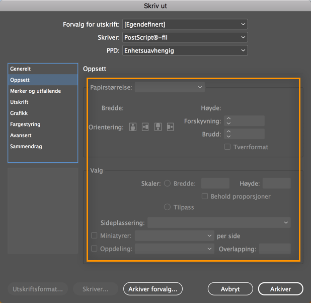 Når du skriver ut et InDesign-dokument som en PostScript-fil, er alternativene for å tilpasse siden deaktivert.