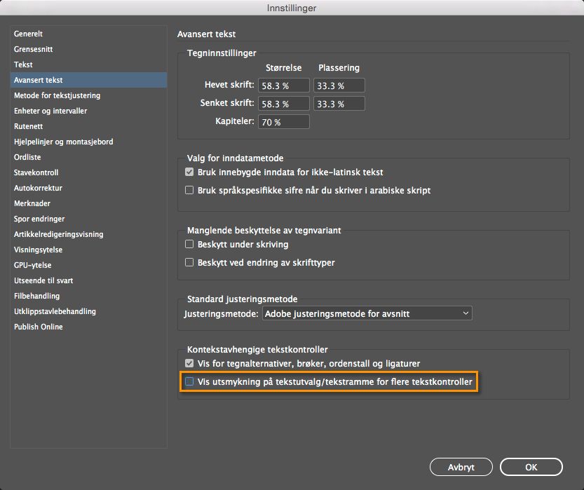 I InDesign går du til Rediger > Preferanser > Avansert type.