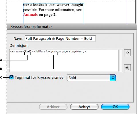Se <cs name=”bold”><fullPara/></cs> på side <pageNum> Se Dyr på side 23. Angi tegnmalnavnet, og inkluder teksten som du vil bruke tegnmalen på, mellom kodene <cs name=””> og </cs>. |