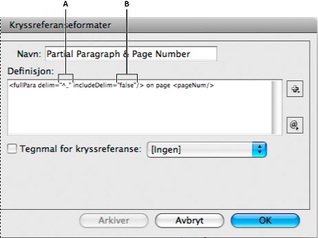 Hvis du vil bruke en tegnstil på hele kryssreferansen, velger du Tegnstil for kryssreferanse, og deretter velger eller oppretter du tegnstilen fra menyen.