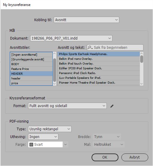 Velg Tekst > Hyperkoblinger og kryssreferanser > Valg for kryssreferanse.