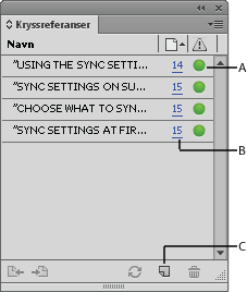 Når du setter inn en kryssreferanse, viser Kryssreferanser-panelet statusen til kryssreferansen. Ikoner angir for eksempel om målteksten skal vises på montasjebordet