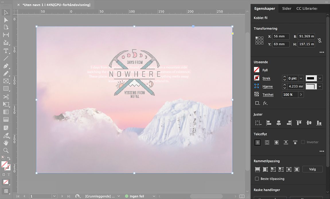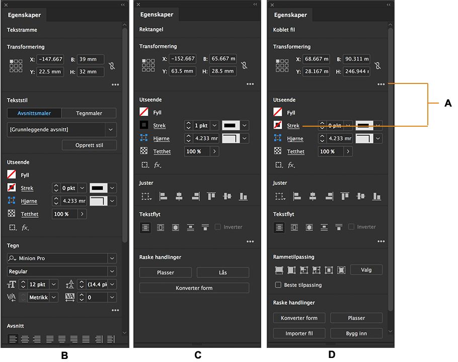 I Egenskaper-panelet i InDesign finner du innstillinger og kontroller for oppgaven eller arbeidsflyten du jobber med. Dette nye panelet er designet med fokus på brukervennlighet og sørger for at du har tilgang til de riktige kontrollene når du trenger dem.