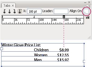 Skriv inn et mønster på opptil åtte tegn i Utpunktering-boksen (Leader-boksen), og trykk Enter. Tegnene du angir, gjentas langs bredden av tabulatoren.